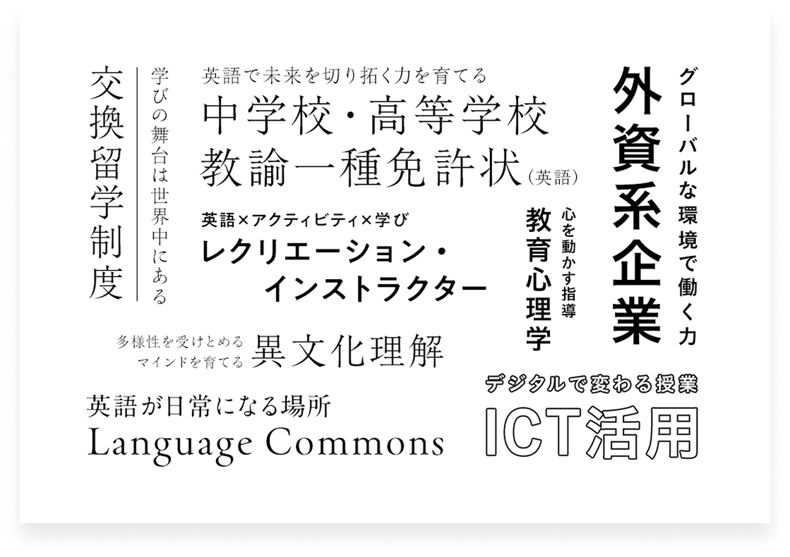 英語の指導に必要なスキルと教養(文化、文学、英語学)を身につける。実践的な英語力を段階的にスキルアップする(レベルに合わせてクラス編成)。