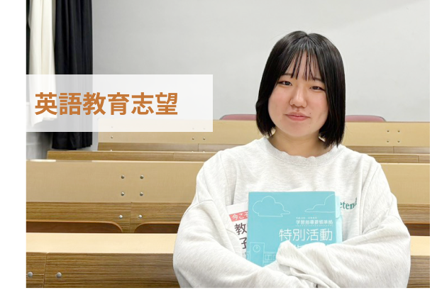 英語教育に興味を持ち、幼少期の英語教室での経験から英語の魅力を伝えたいと考え教育学部発達科学科英語教育専攻へ進学。ゼミでは英語学や発音に関する研究を行い、発表練習を重ね表現力を磨いています。学生リーダーとしてオープンキャンパスや卒業式の運営、学園祭ではミスター・ミスコンの企画運営にも携わり、協調性と責任感を育みました。自ら行動し人と関わる力が向上し、リーダーとしての立ち振る舞いや管理能力も習得。現在は教職課程を終え、英語教員採用試験に向けて努力を重ねており、将来は中学校英語教員として生徒に英語の楽しさを伝えたいと考えています。