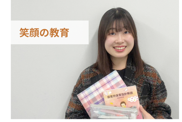幼い頃に憧れた保育士をめざし、保育や幼児教育について4年間学んでいます。ピアノや造形など実技にも力を入れ、保育士・幼稚園教諭の資格取得をめざして学習中です。ゼミでは「木育」を研究し、子どもの成長と自然との関わりを探っています。所属するバドミントンサークルではイベント運営や他学科との交流を通して行動力と協調性を磨きました。大学生活を通して自立心と責任感が育ち、将来は子どもや保護者から信頼される保育者をめざしています。また、自分らしく人生を楽しむことも大切にしていきたいです。