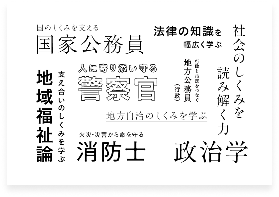 行政や政策、地方自治に関連する法律を幅広く学び、公務員として実務を行う上での基礎となる知識を深める。