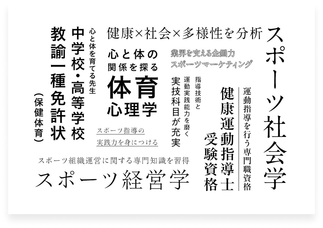 他者の技能を向上させるための指導力を学ぶ。多くの専門的な学びに触れるとともに、実践現場を知り、スポーツの価値をより深く理解する。