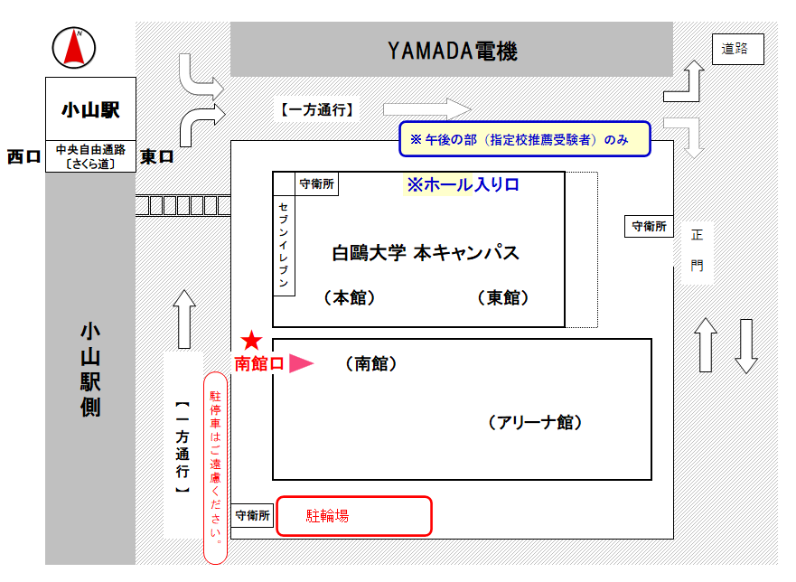 | 特記事項 | (1)試験場は、JR小山駅東口から徒歩1分にあります。 (2)本キャンパスには駐車場がありませんので、公共の交通機関をご利用ください。 試験当日は、建物周辺の混雑が予想されますので、交通規制を次のように行います。 〔受験生の車輌等〕 車輌の構内乗り入れは、禁止とします。 自転車・バイク利用者は、正門で降り、押して構内に入り、所定の駐輪場に置いてください。 〔付添者の車輌〕 車輌の構内乗り入れは、禁止とします。 送迎時の正門付近での停車はお止めください。小山駅東口道路では徐行をお願いします。 また、駅周辺の一方通行にご注意ください。 注)大学周辺店舗の駐車場は営業のご迷惑となりますので、コインパーキングをご利用ください。 (3)付添者、引率者は試験場(建物内)に入れません。 (4)当日は、暖房や室温変化などに対応できる服装でお越しください。 (5)上履きは必要ありません。 (6)昼食(軽食等)は各自持参してください(学生食堂は営業しておりません)。 (7)昼食場所には、各自の試験室をご利用ください。ごみの持ち帰りにご協力ください。 ご不明な点がございましたら、入試部(0120-890-001)までご連絡ください。 ■試験要項2026詳細はこちら (PDF) |